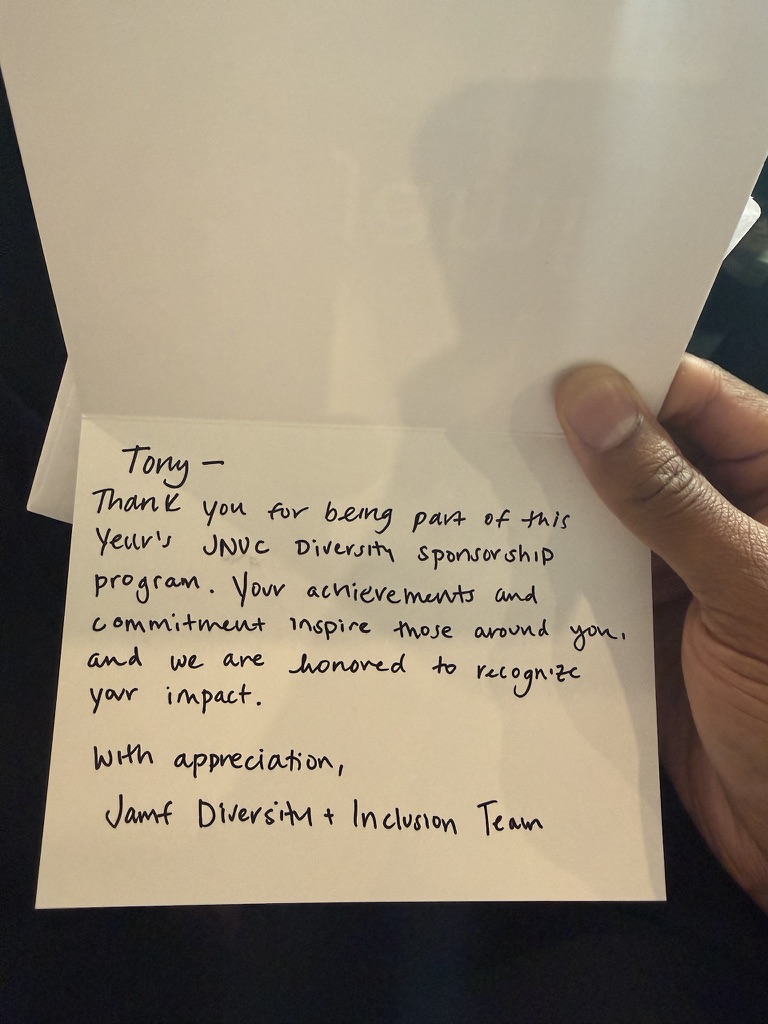 At lunch, I joined Jamf’s leadership for the Diversity Sponsorship Lunch, discussing representation, mentorship, and leadership pipelines. We discussed things large and small, such as favorite tech tools, how we are automating, and even Jamf pursuing FedRAMP status (IYKYK). Being able to be in the same room as CEO John Strosahl, and Chief Customer Offer Sam Johnson who we so often see on stage at JNUC, and so many others from the leadership had to be by far the best part of the entire conference for me, personally. We held personal talks while enjoying great food. Those conversations re-anchored my five-year vision for both technical mastery and community impact.