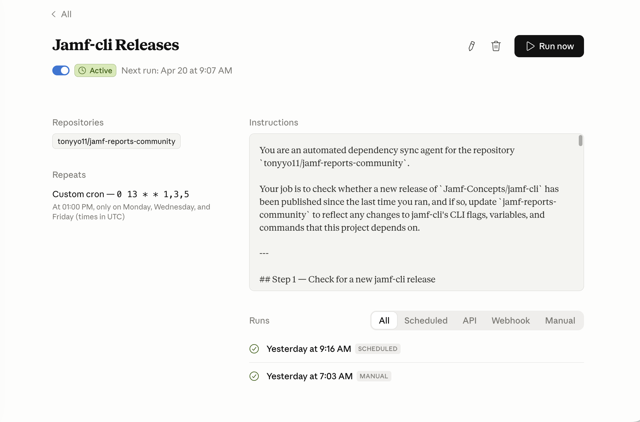 To help with that, I set up a Claude Code routine that checks jamf-cli releases on a schedule, reviews the newest version against the last one I processed, diffs the release notes and CLI-facing changes, and proposes any needed updates as a branch and pull request. It’s not there to replace human review. It’s there to make sure upstream movement doesn’t go unnoticed, even when life gets busy.